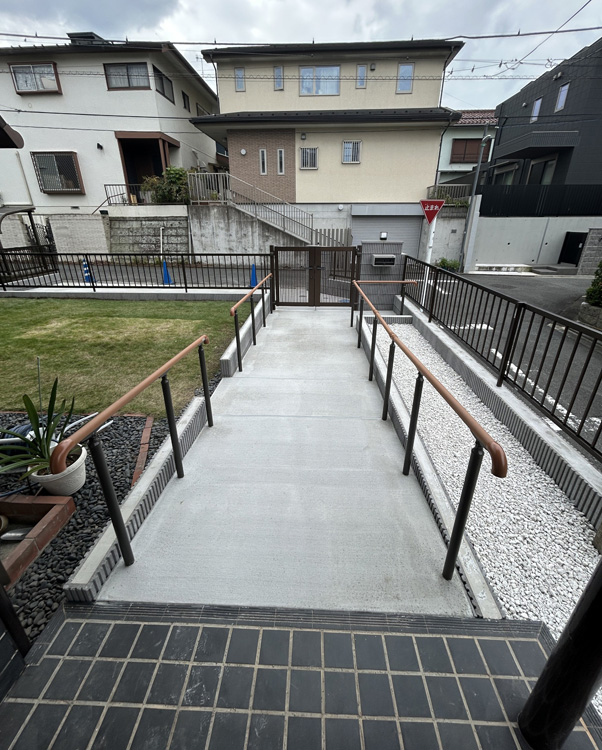 工事は庭土の撤去から地盤の整形、コンクリート打設、仕上げまで一貫して丁寧に施工を行いました。まず庭の一部を車椅子でも安全に乗り入れできるように掘削し、路盤をしっかりと転圧して強度を確保。その上にコンクリートを打設して平坦な駐車スペースを形成し、続いて玄関までのアプローチにスロープを設けました。動線は直線的に設計し、車から降りてそのまま玄関まで進めるよう配慮。傾斜は緩やかに設定し、介助なしでも安心して上り下りができるよう工夫しています。