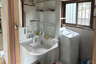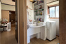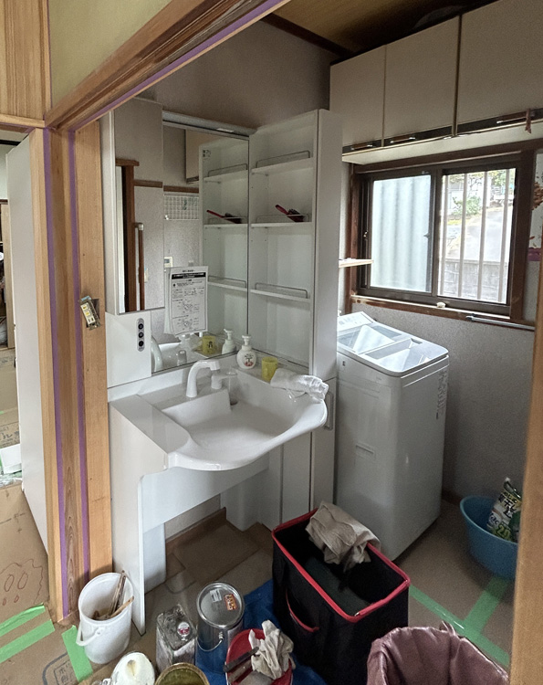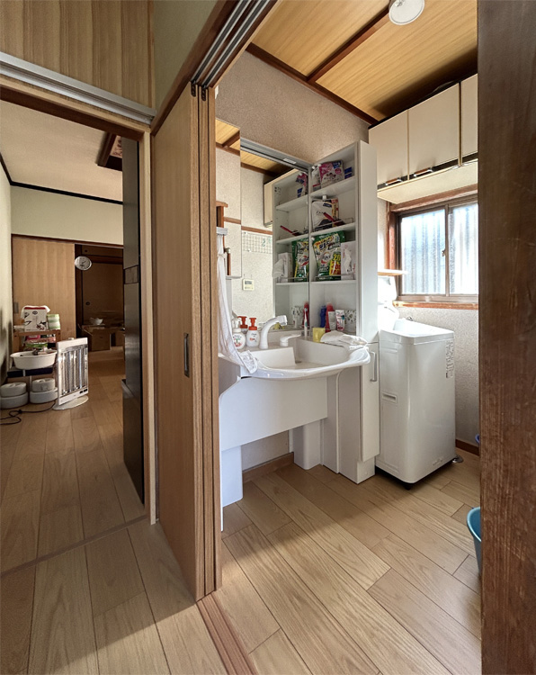 洗面所は、車いすでも使いやすい仕様の洗面台へ交換し、座ったままでも鏡やボウルに無理なく手が届く高さと形状に改善しました。併せて開口部も見直し、出入りしやすい空間へと整えています。