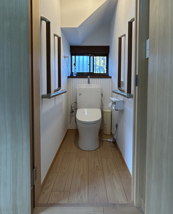 一段低かったトイレは、廊下と同じレベルに床を上げ、それに伴って、天井高を上げる工事も行いました。