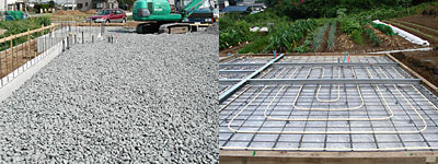 蓄熱冷暖基礎を構成する砂利層は、快適な住環境を支える大きな役割を担っています。砂利層には、地中からの熱をためる蓄熱体としての働きがあります。蓄熱される温度は、真冬の15s℃から真夏の25℃のサイクルで保たれています。この蓄熱が床上つまり室内(1階部全室)に働きかけ、天然の冷暖房効果を発揮します。さらに従来基礎の住宅よりも、室内の温度変化(日格差 、季節格差)が極端に少ないため、エネルギー効率の良い冷暖房が可能となります。